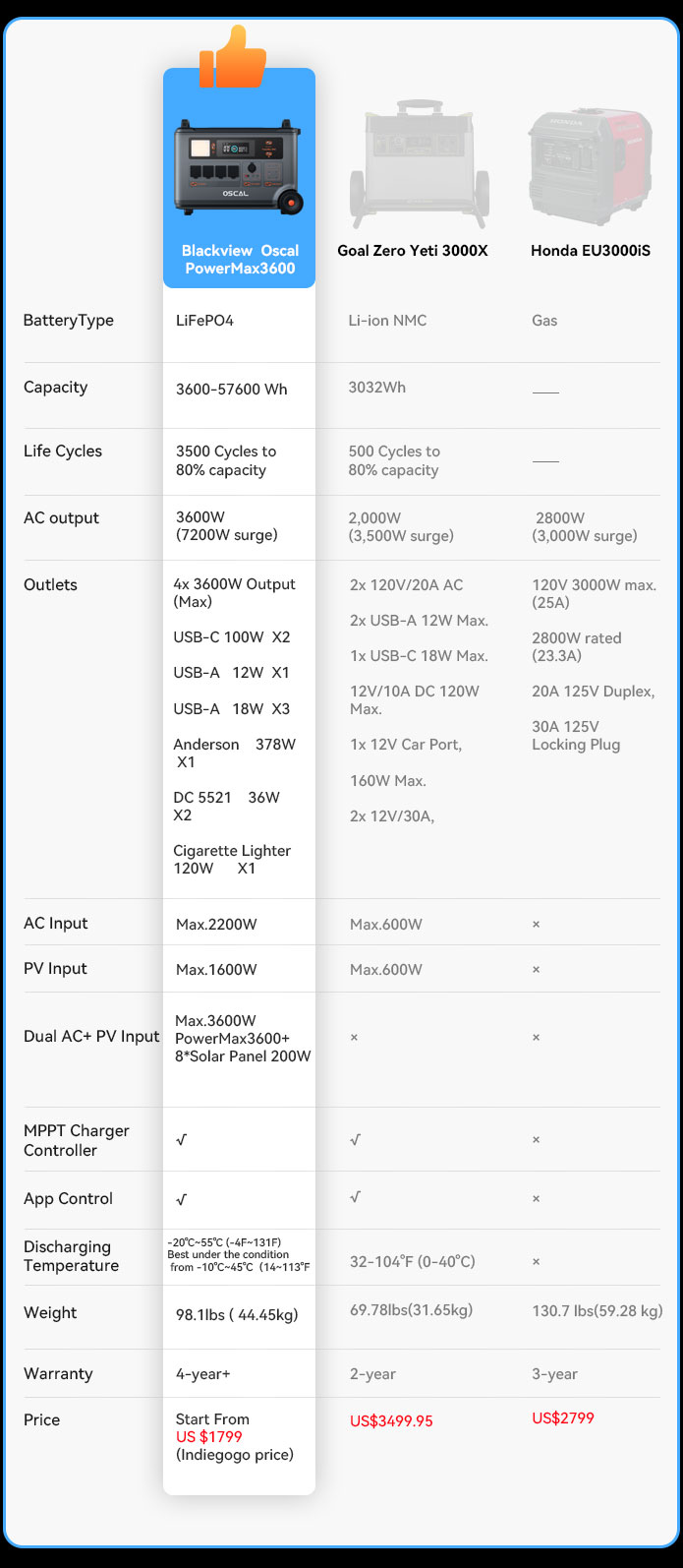 安全性と耐久性はBlackview Oscalの使命の礎です。PowerMax 3600では、先進のLiFePO4バッテリーを採用。1日おきの使用でも3500回の充電サイクル、約25年のもの使用が可能です。